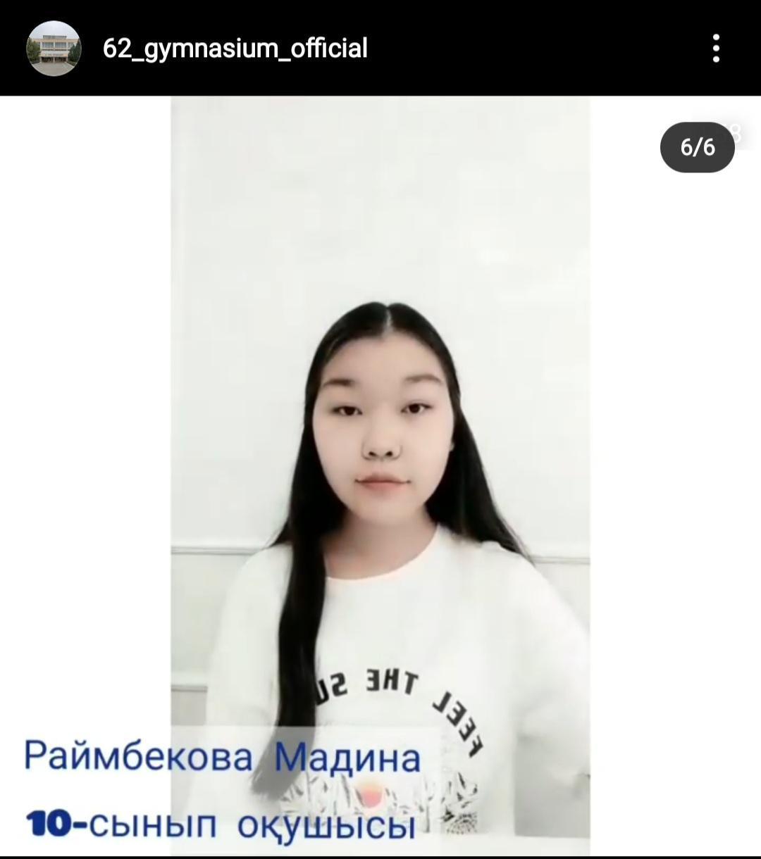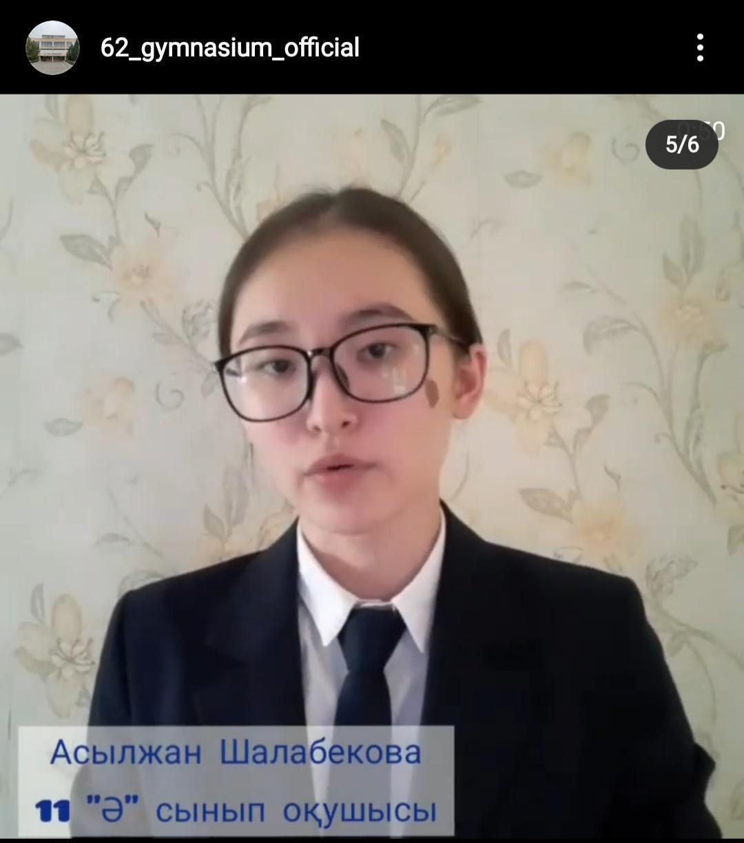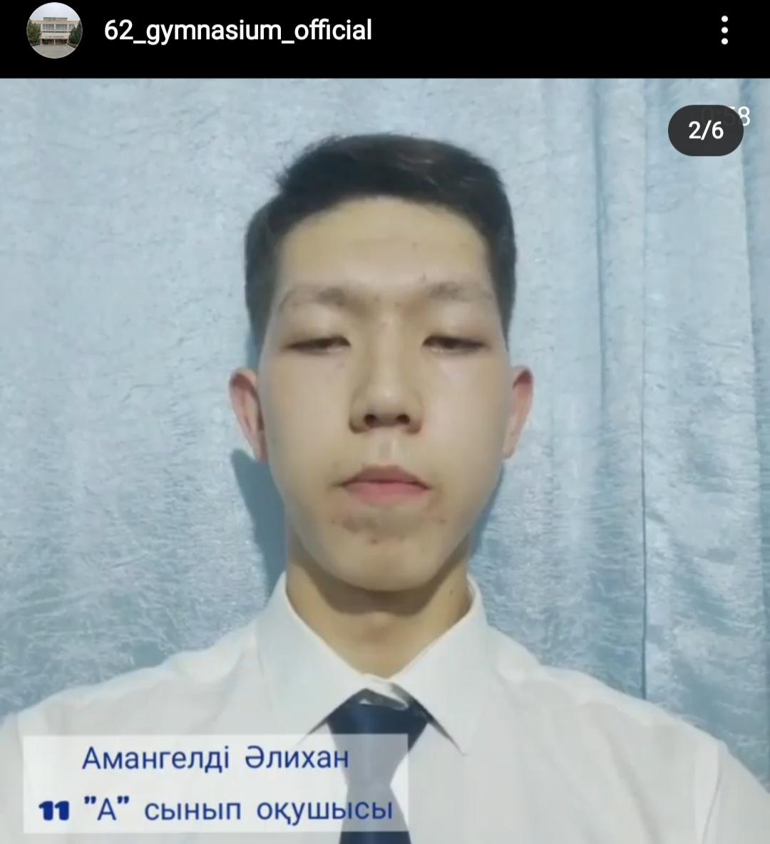 2021 жылғы жазғы демалыс кезеңінде мектеп парламенттерінің Алматы өңірлік Балалар мен жастарды тәрбиелеу бағдарламасын іске асыру мақсатында гимназия оқушылары арасында "Ұлы Даланың - Ұлы есімдері" тақырыбында гимназия оқушылары Абайдың қара сөздерін онлайн жатқа оқып 62_gymnasium_official парақшасына жарияланды.