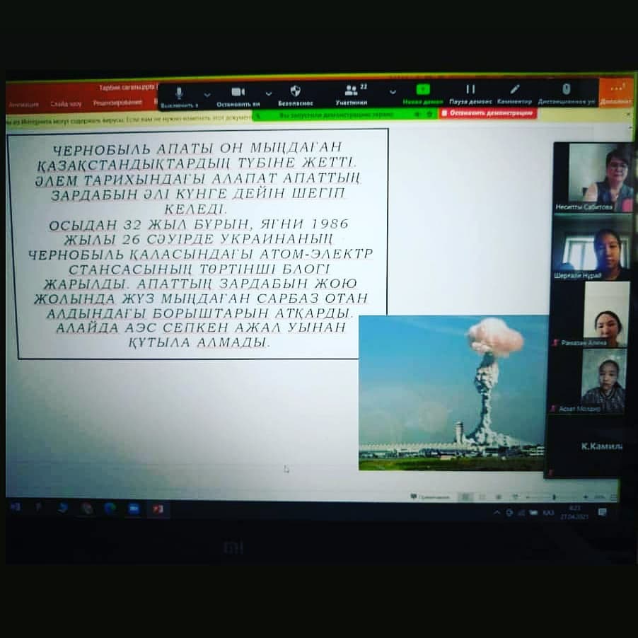 27 апрель 2021 0 1 2 3 4 5 "Чернобыль - қайғылы оқиға, ерлік, ескерту" тақырыбында тәрбие сағаты Шона Смаханұлы атындағы №62 гимназияда 27.04.2021 ж Чернобыль апатының тарихы, апат салдарын жоюға аттанғандардың ерлігін өскелең ұрпаққа насихаттау мақсатында 9 "Ә" сыныбымен жетекшісі Н.Сабитова "Чернобыль - қайғылы оқиға, ерлік, ескерту" тақырыбында тәрбие сағатын өткізді.