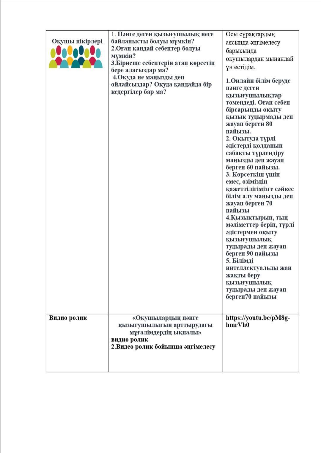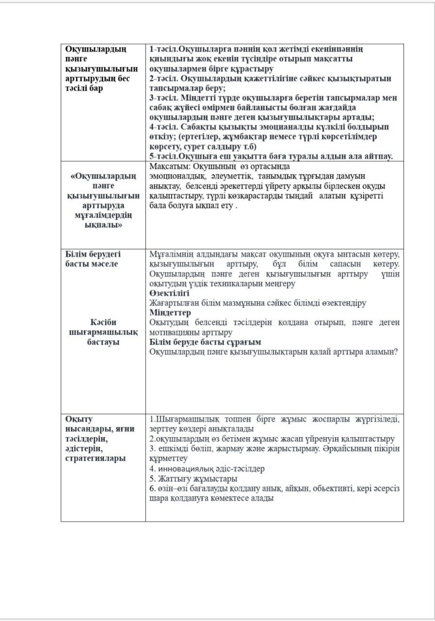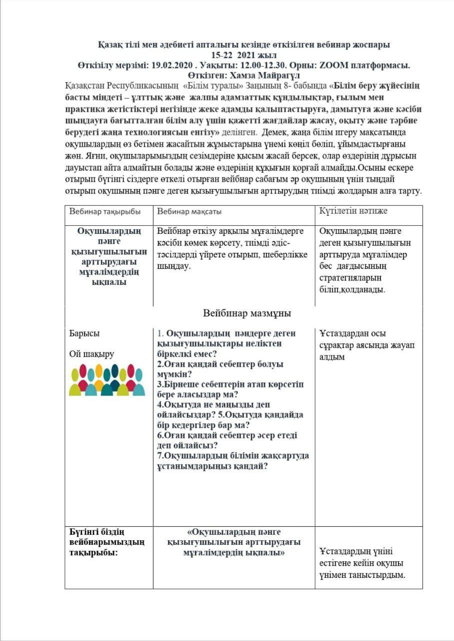 16 февраль 2021 0 1 2 3 4 5 М.Хамза "Оқушылардың пәнге қызығушылығын арттырудағы мұғалімдердің ықпалы"атты вебинар өткізді Қазақ тілі мен әдебиеті апталығы кезінде М.Хамзаның "Оқушылардың пәнге қызығушылығын арттырудағы мұғалімдердің ықпалы" тақырыбында өткізген вебинар жоспары