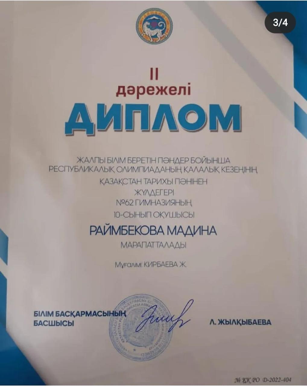 1. Қазақстан тарихы пәні бойынша 10-сынып оқушысы Раимбекова Мадина 🥈дәрежелі диплом иегері, жетекшісі: Кирбаева Ж.К.