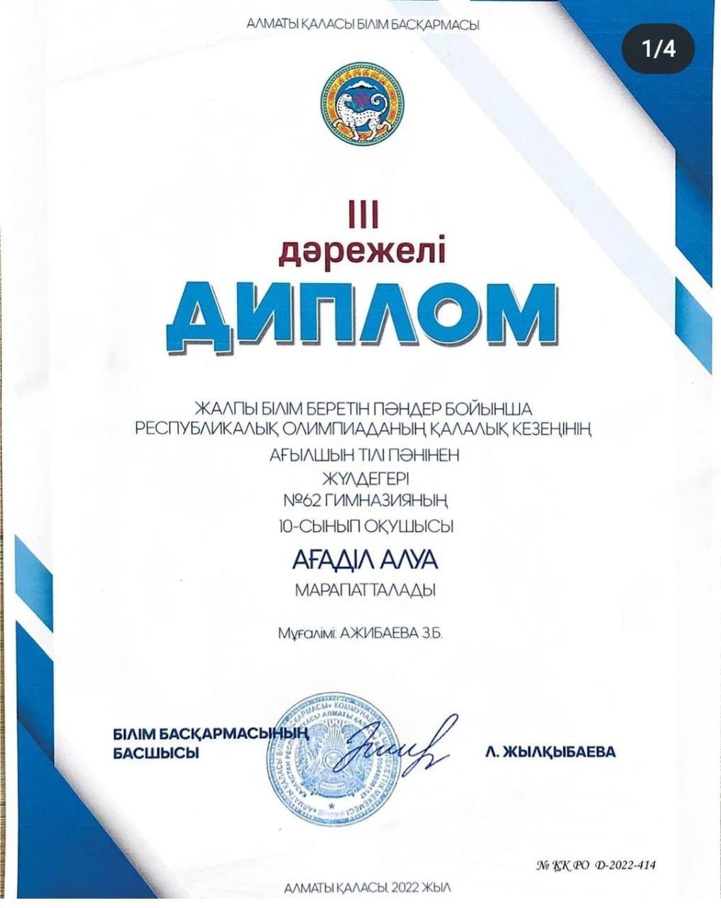 2. Ағылшын тілі пәні бойынша 10-сынып оқушысы Ағаділ Алуа 🥉дәрежелі диплом иегері, жетекшісі:Ажибаева З.Б.