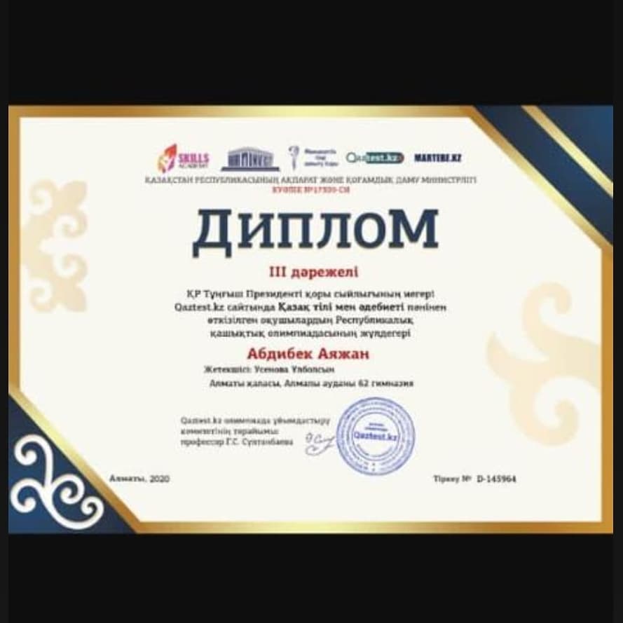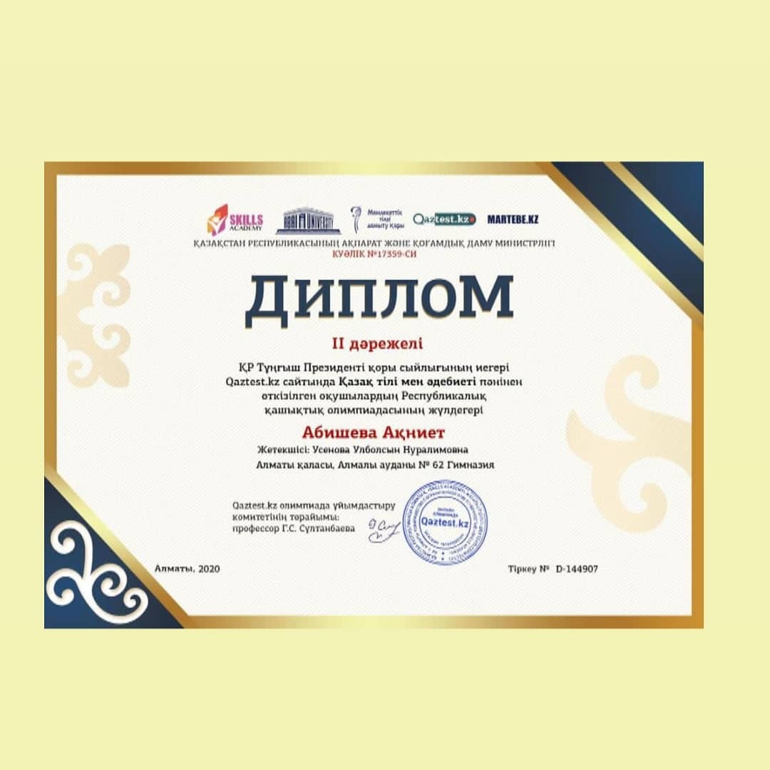 ҚР Тұңғыш Президенті қоры сыйлығының иегері Qaztest.kz сайтында Қазақ тілі мен әдебиеті пәнінен өткізілген оқушылардың Республикалық қашықтық олимпиадасының жүлдегерлері Ш.Смаханұлы атындағы №62 гимназияның 10 "Б" сынып оқушысы Абишева Ақниет II дәрежелі дипломмен, 6 "Ә" сынып оқушысы Абдибек Аяжан III дәрежелі дипломмен марапатталды. Жетекшісі: Усенова Улболсын.