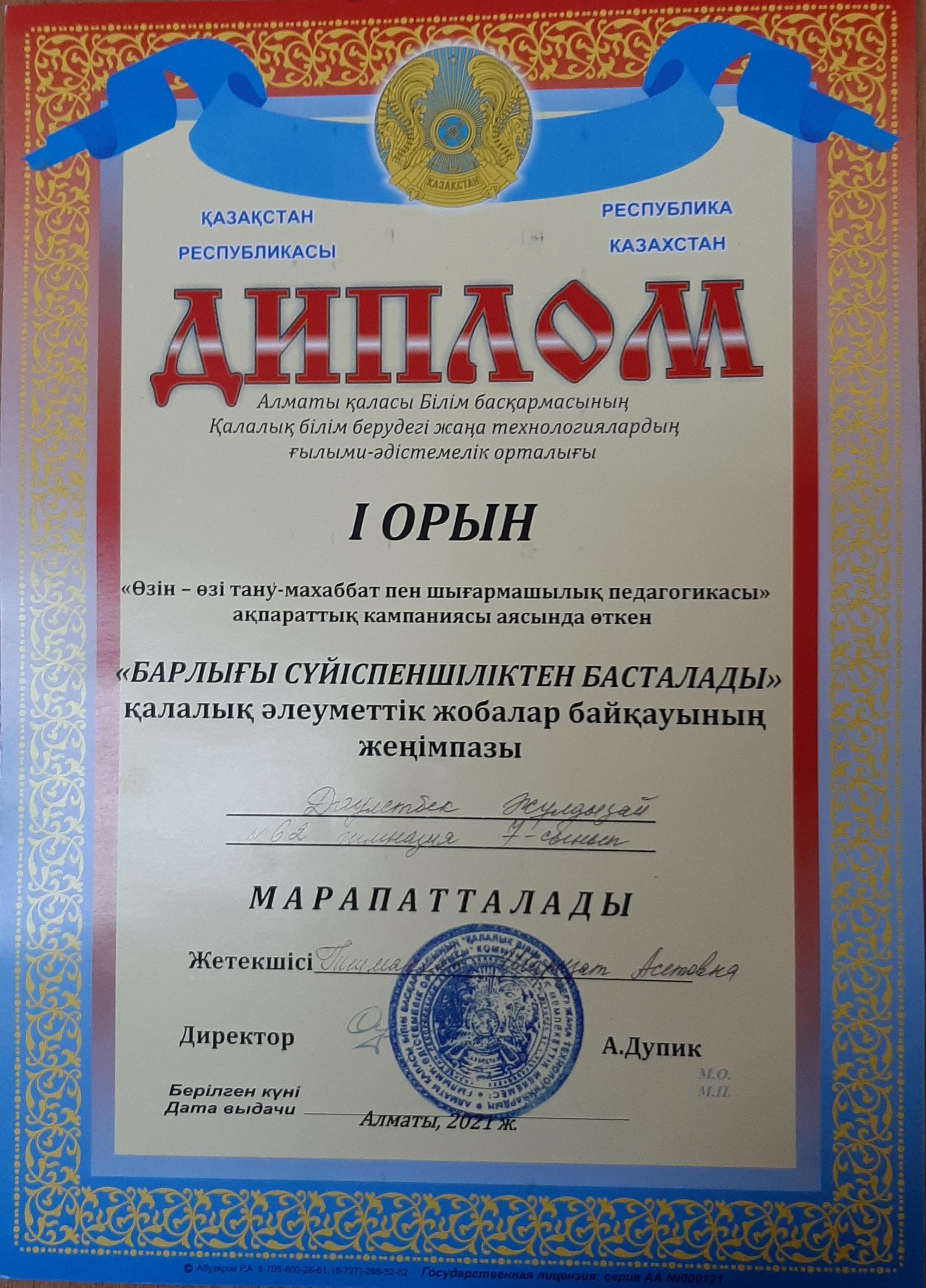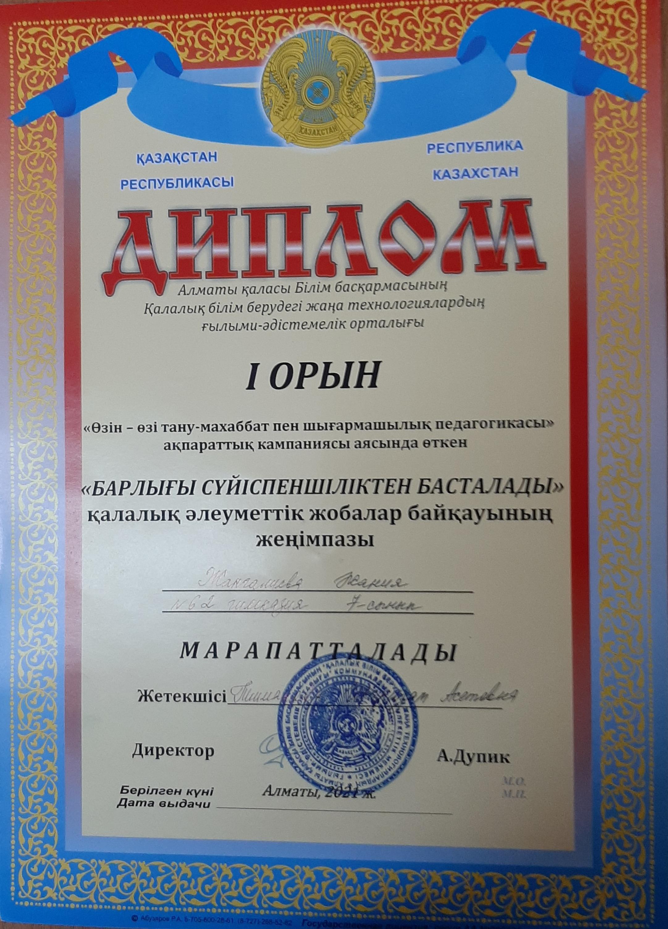 "Өзін-өзі тану - махаббат пен шығаршылық педагогикасы" ақпараттық кампаниясы аясында өткен "БАРЛЫҒЫ СҮЙІСПЕНШІЛІКТЕН БАСТАЛАДЫ" атты қалалық әлеуметтік жобалар байқауының жеңімпаздары гимназиямыздың 7-сынып оқушылары Түзелбай Гульнафис, Жангалиева Жансая, Даулетбек Жұлдызай жүлдеді🥇 I орын алып, дипломдармен марапатталды.