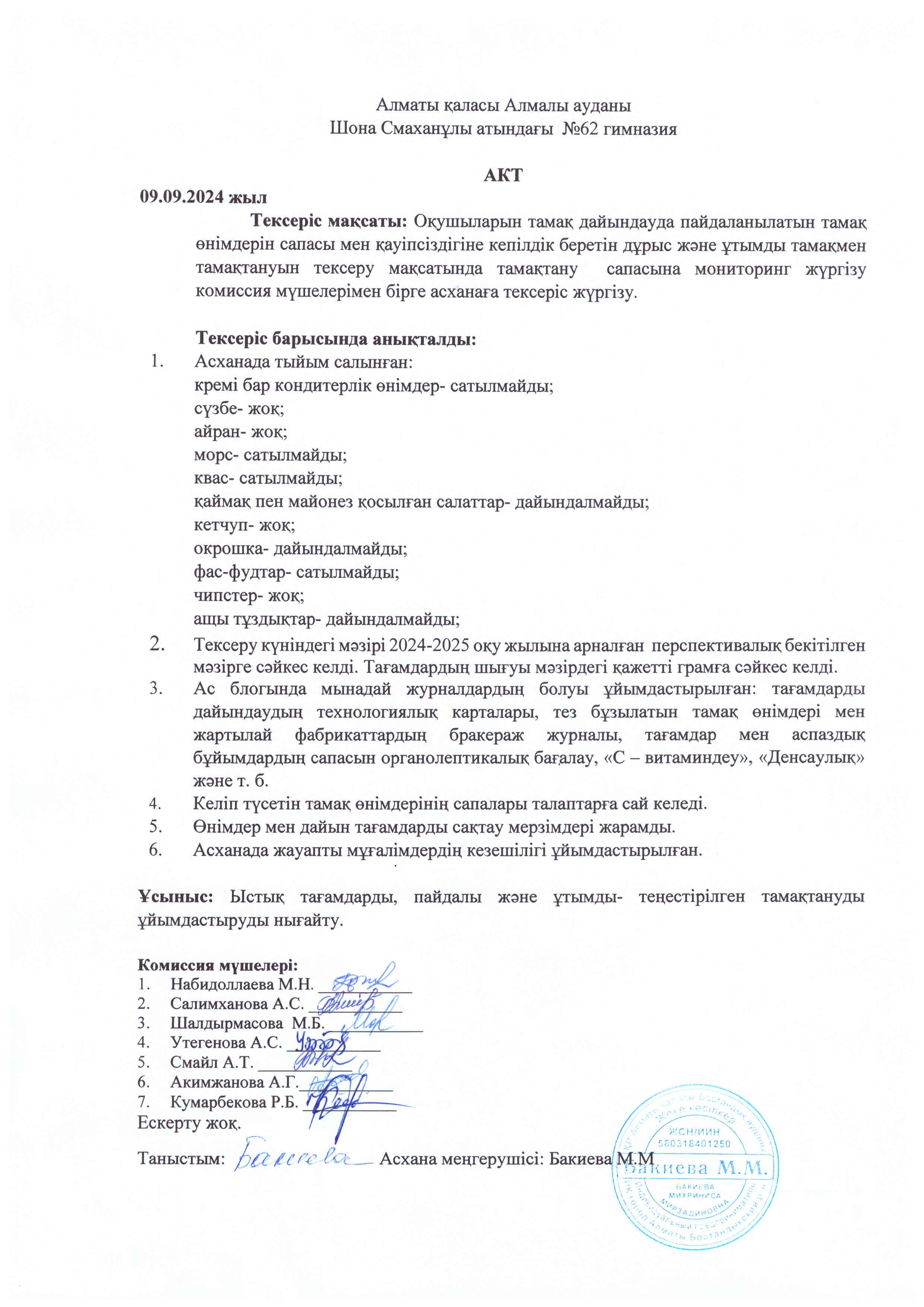 Тамақтану сапасына мониторинг жүргізу комиссия мүшелеріне №3 актісі